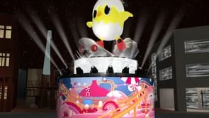 [2017台北燈會系列-3]雞流歷險循環動畫小奇雞家族們乘坐救生圈,在湍急河流中四處探險。他們有時會穿越橋樑底下的隧道,要小心不要撞上。有時還會互相比賽誰的救生圈游的比較快。周圍還有巨型製蛋機及運送雞蛋寶寶的雲霄軌道車。